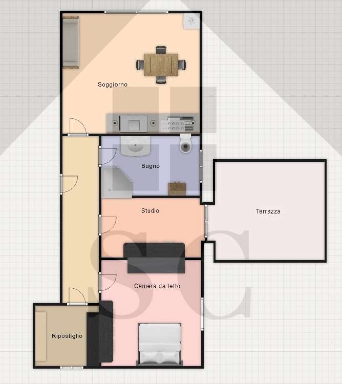 Posizionato al piano terreno, si compone di ingresso a corridoio, soggiorno con parete cottura, camera da letto, cameretta/studio, ripostiglio, bagno finestrato con box doccia.