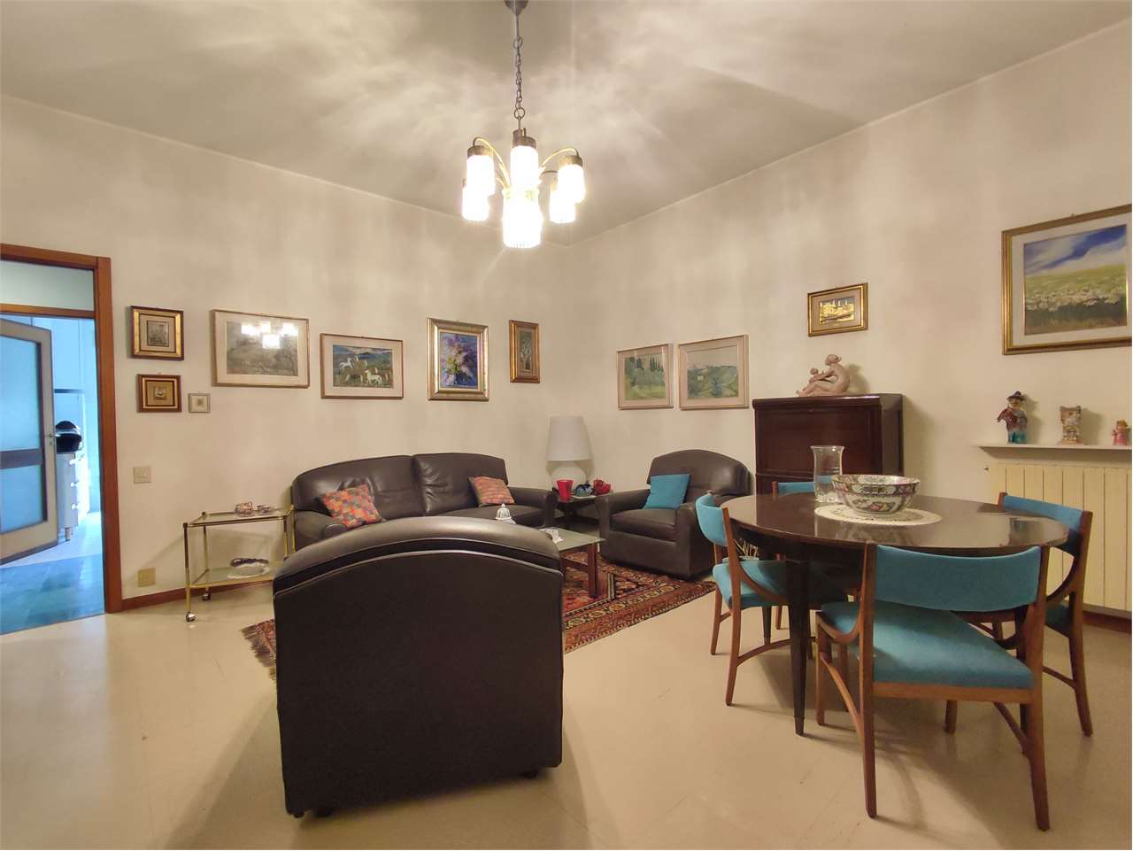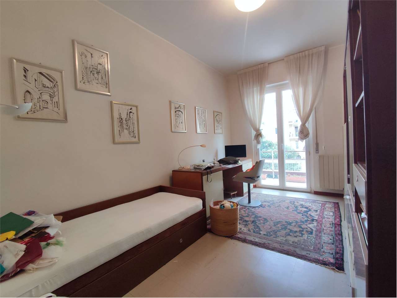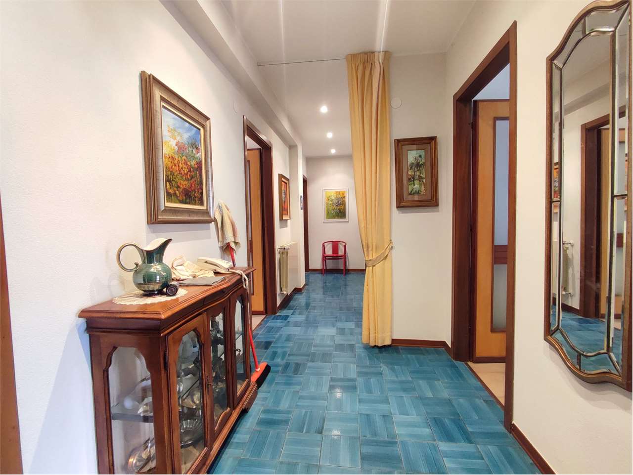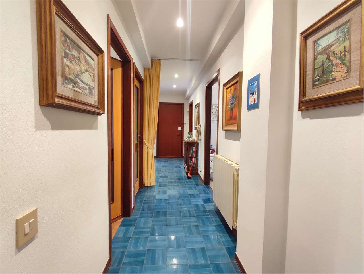 Si compone di ingresso a corridoio, ampio soggiorno, tinello e cucina, tre camere da letto, doppi servizi finestrati.