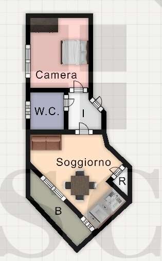 Si compone di ingresso su disimpegno, soggiorno con angolo cottura e ripostiglio, camera da letto, bagno finestrato.