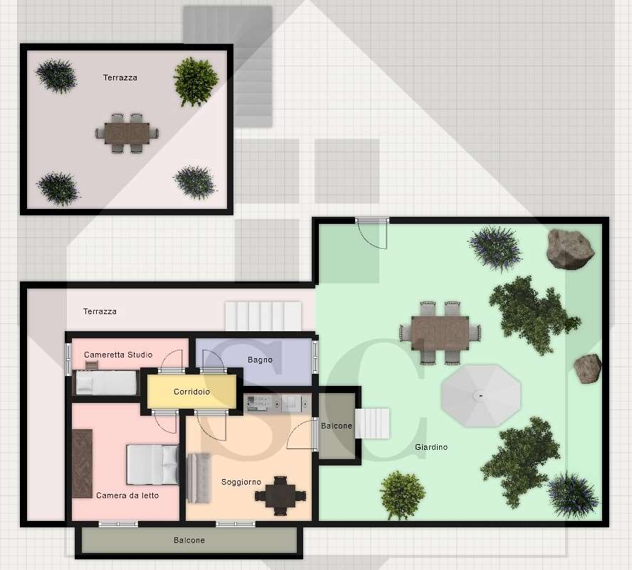 E' dotato di ingresso indipendente ed è privilegiato dagli ampi spazi esterni, fra giardino piantumato e terrazzo soprastante.