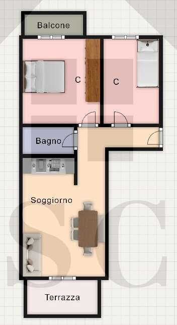 E' composto di ingresso a disimpegno, uno spazioso soggiorno con cottura a vista e affaccio sul terrazzo rivolto a sud, due camere da letto (una con uscita su balcone), bagno con box doccia e dotato di tiraggio forzato.