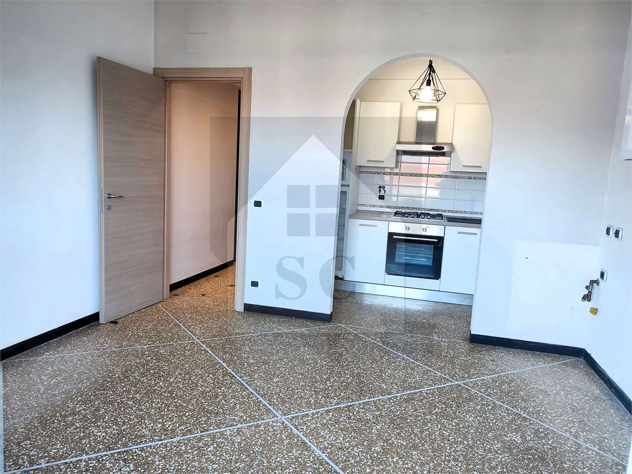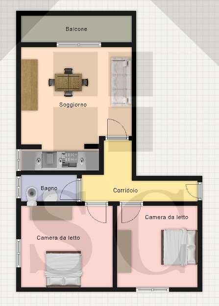 Ha l'ingresso a corridoio, soggiorno con cucinotto finestrato, due camere da letto, bagno finestrato con piatto doccia.