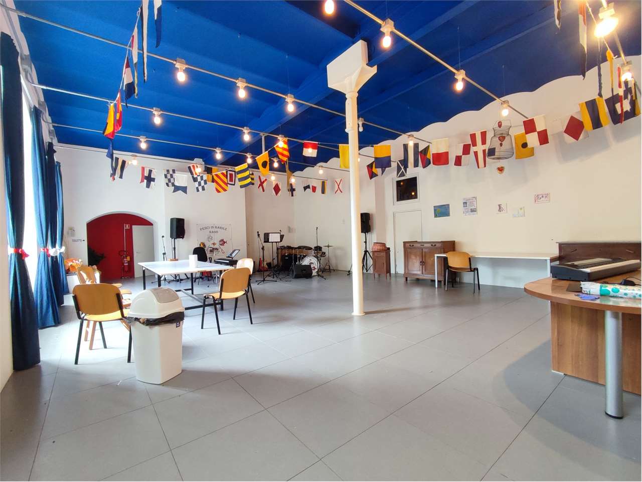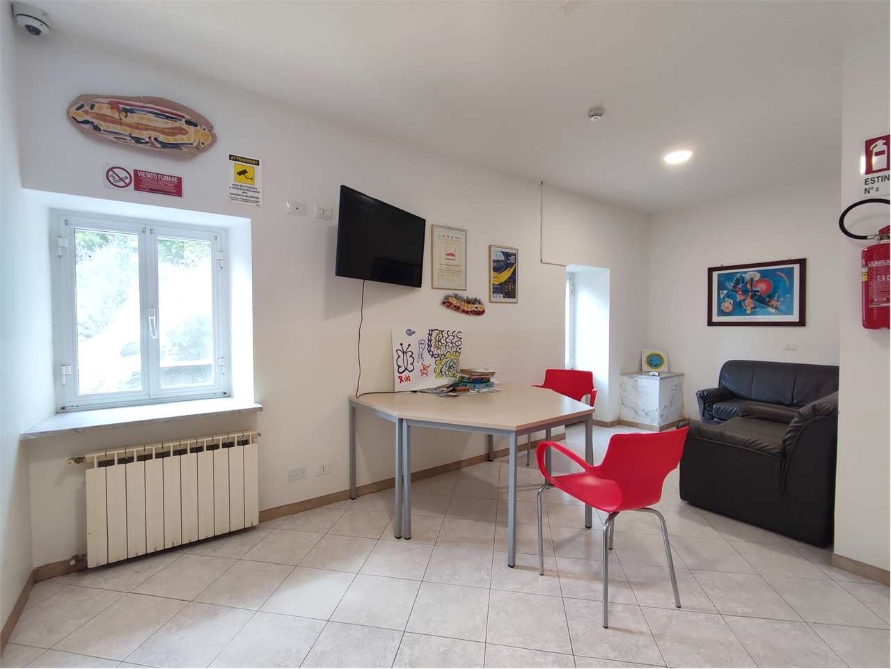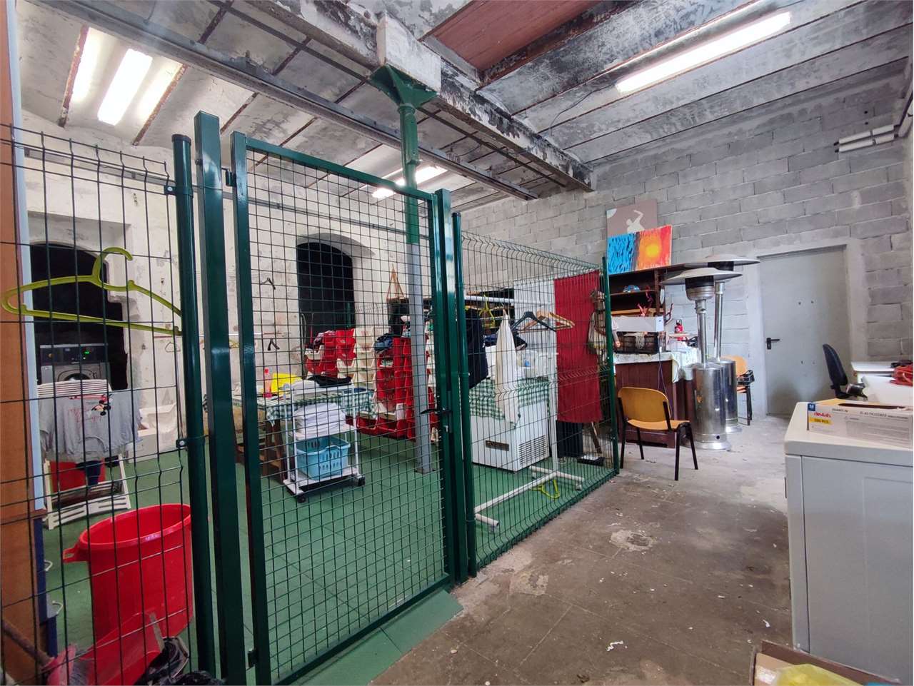 Il piano terreno è adibito ad uffici, sala polivalente e locali tecnici (lavanderia e officina)