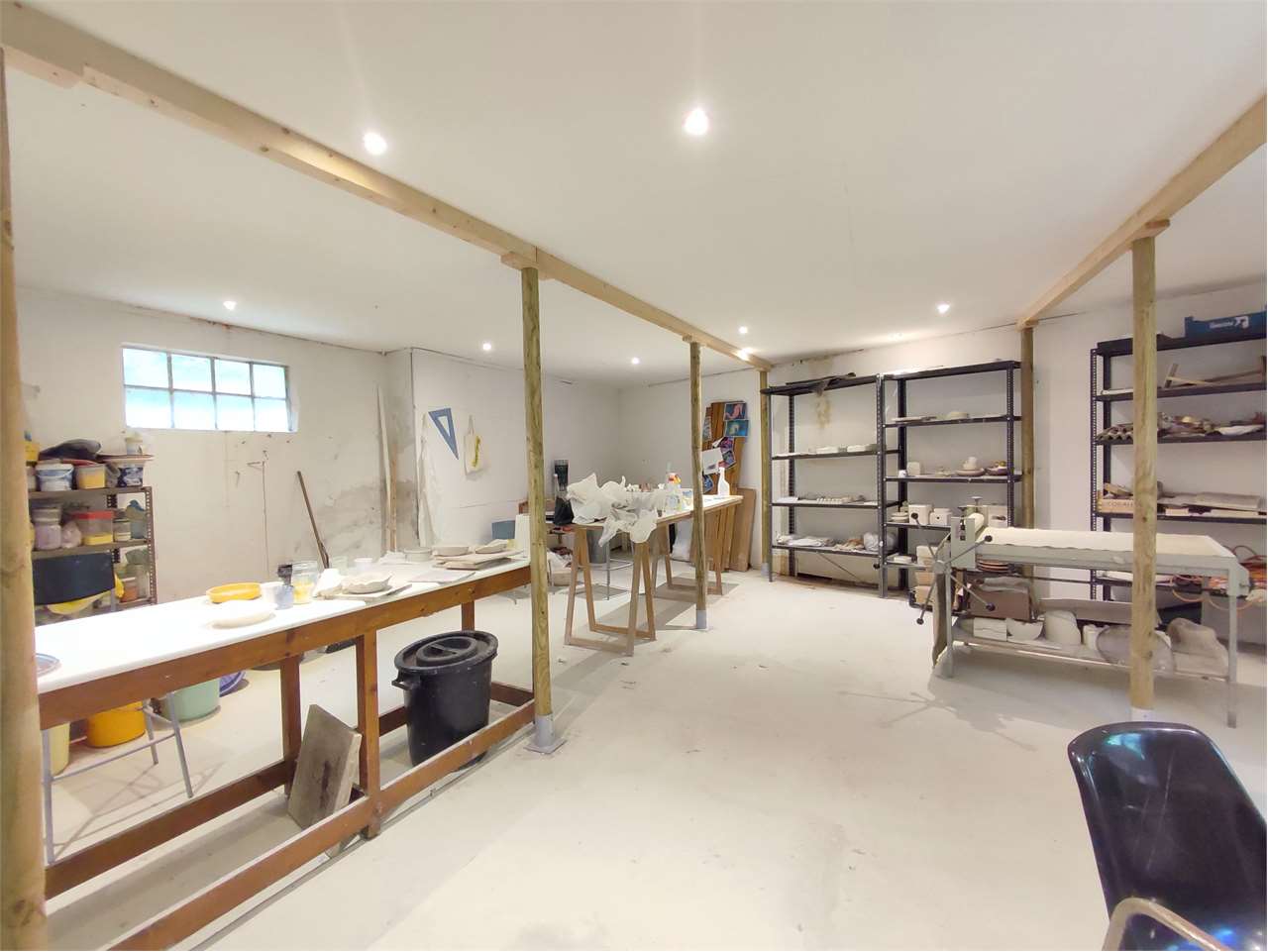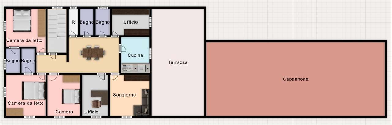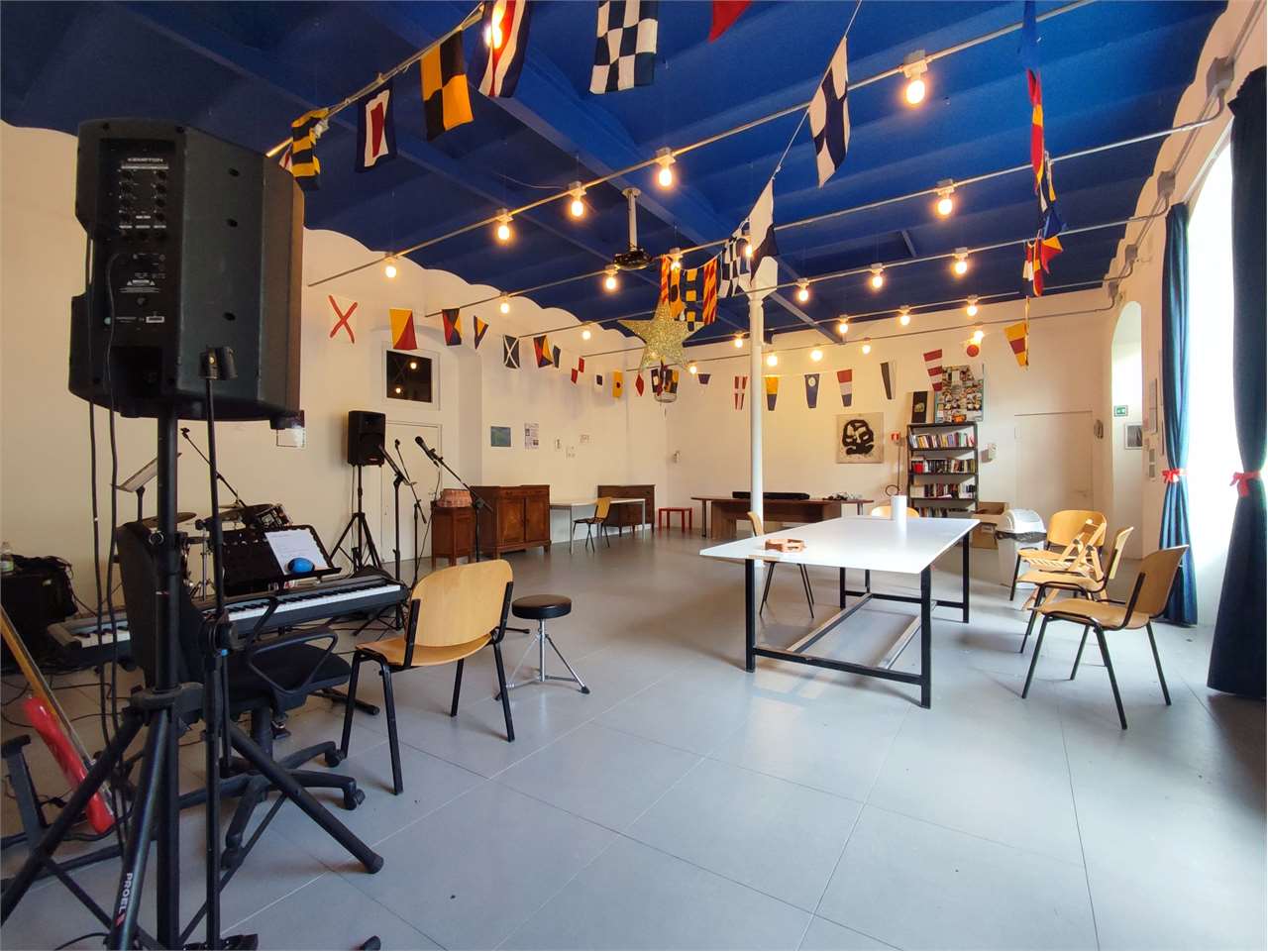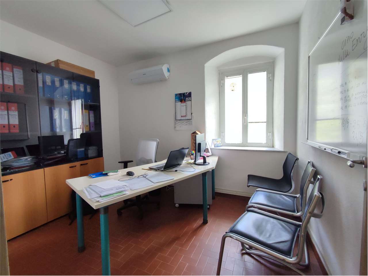 Il piano terreno è adibito ad uffici, sala polivalente e locali tecnici (lavanderia e officina)
